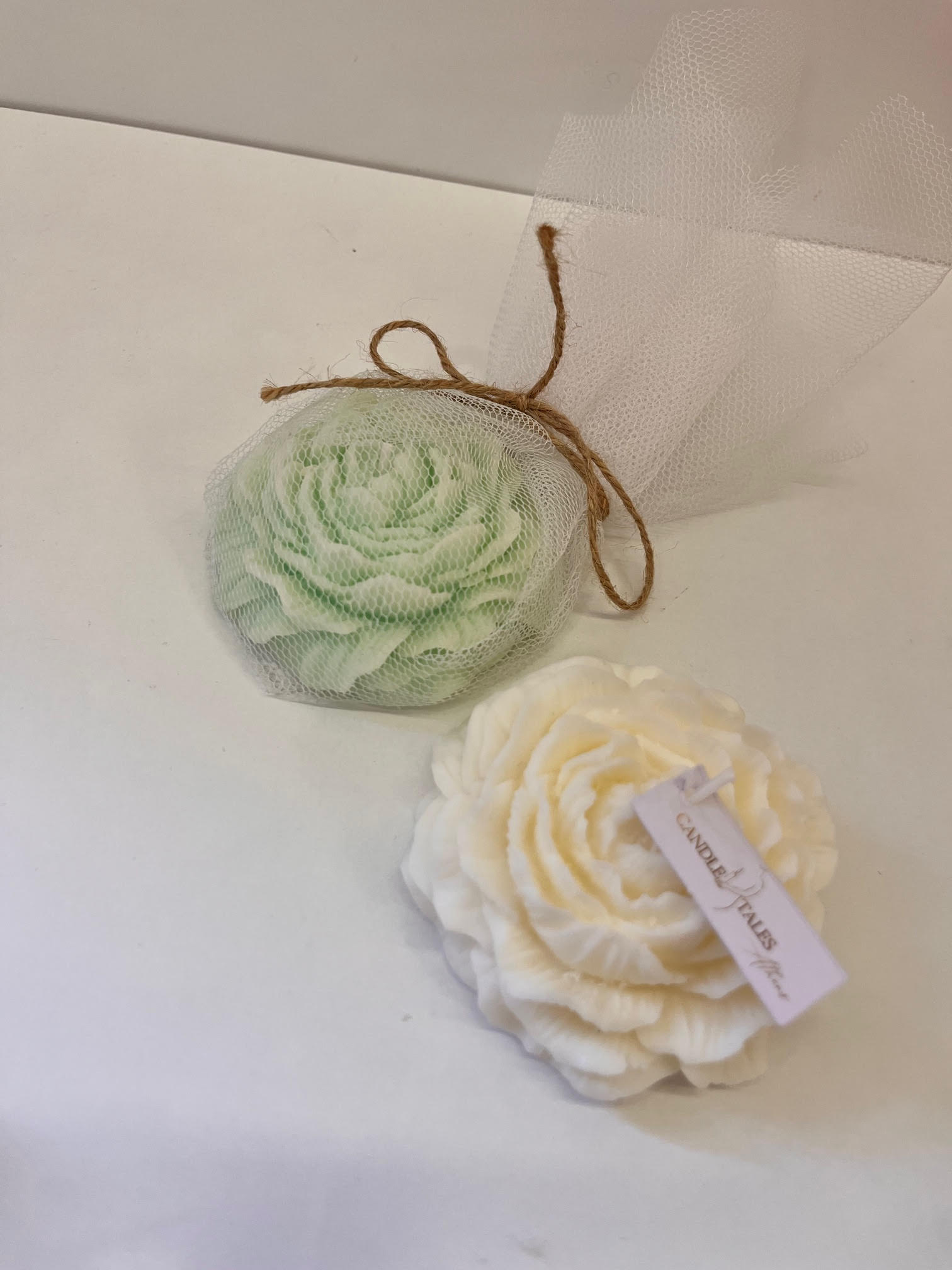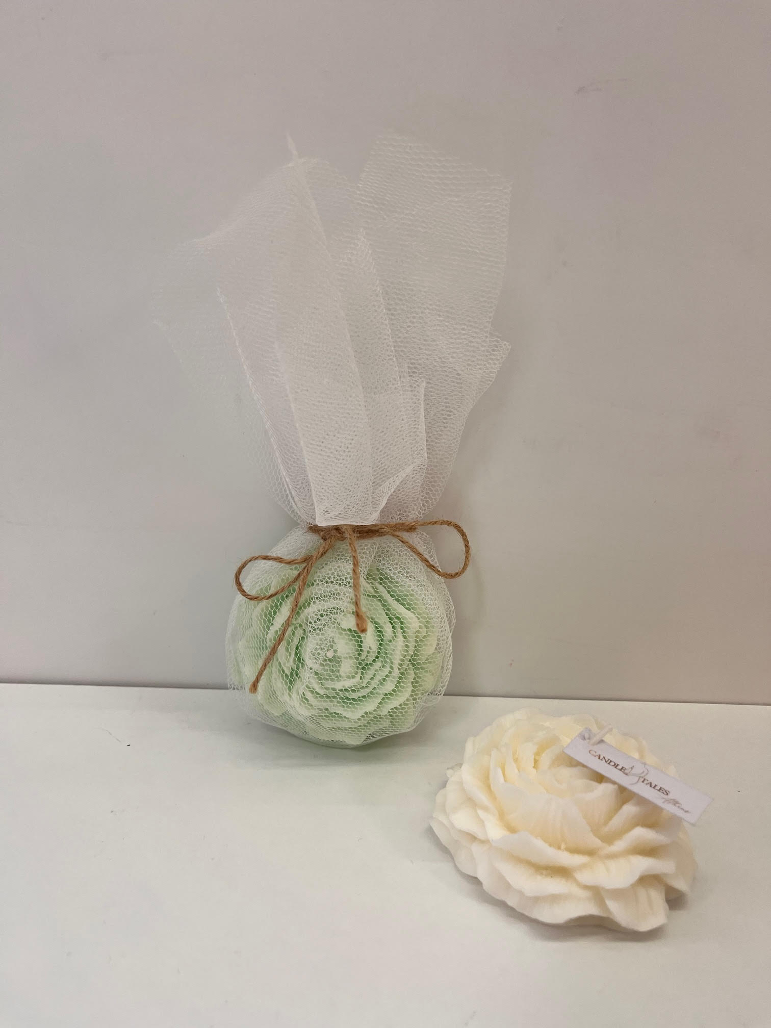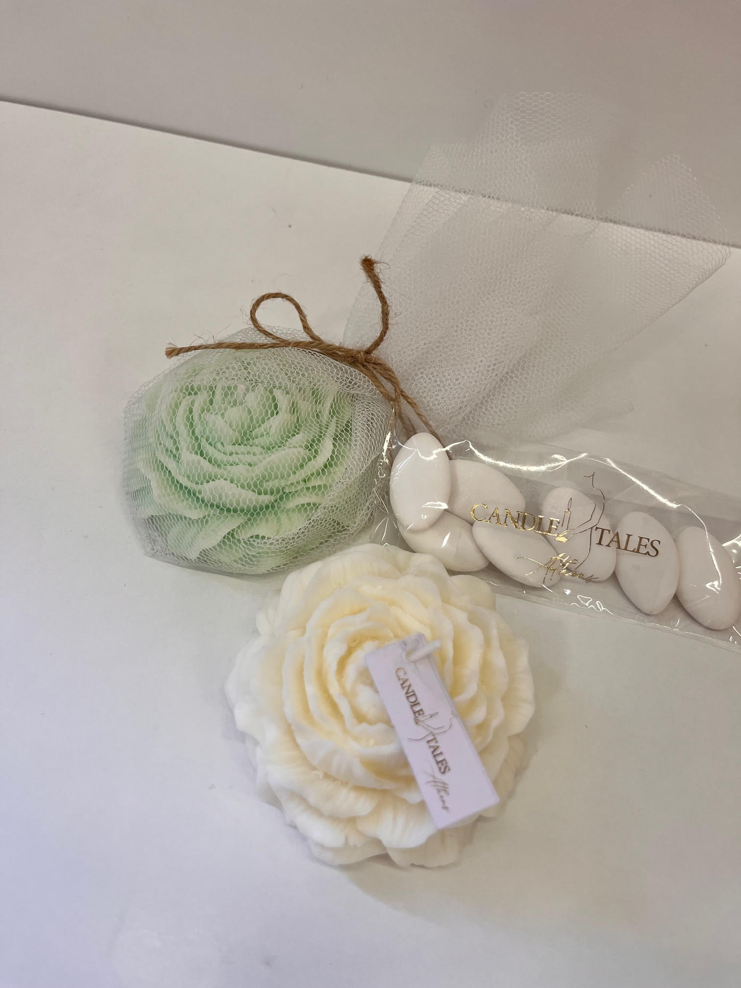 Χειροποίητη μπομπονιέρα με αρωματικό κερί σε σχήμα παιώνιας (8cm*4cm), σε επιλογές φυσικών αποχρώσεων. Συνοδεύεται από κουφέτα σε συσκευασία, δεμένα με σπάγκο για μια ζεστή, φυσική αισθητική. Μπορεί να προσωποποιηθεί ως προς τα χρώματα, το άρωμα του κεριού και τις λεπτομέρειες της παρουσίασης.